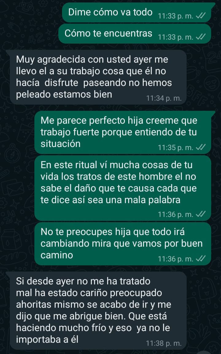 Los resultados que se muestran son evidencia de nuestro trabajo, sin embargo cada resultado puede variar según la persona y servicio que desees. Consulta con un Brujo para poder asesorarte en el mejor trabajo para tu caso.